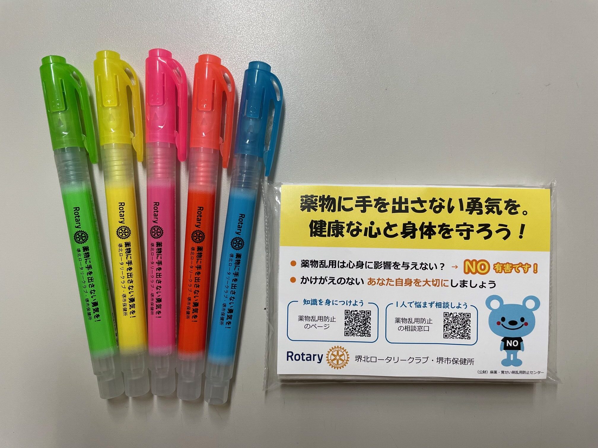 今年度は、当クラブ創立45周年という節目の年でもあり、募金額が一定額に達したことから、堺市保健所 保健医療薬務課へ薬物乱用防止啓発資材として、ポケットティッシュ2,300個と蛍光ペン3,200本を寄贈いたしました。