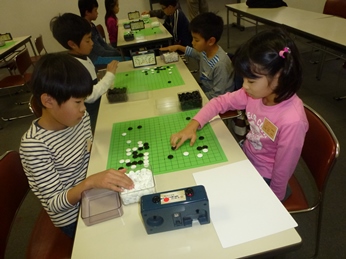 Cクラスでは、20級から30級と初心者ばかりの参加のため、初心者用の13路盤での対局でしたが、 付き添いの保護者が心配そうに見守る中で対局開始となりました。囲碁の面白さが分かり始めた頃かな、 子どもたちの生き生きとした表情を見ているとやってよかったなと思った次第です。